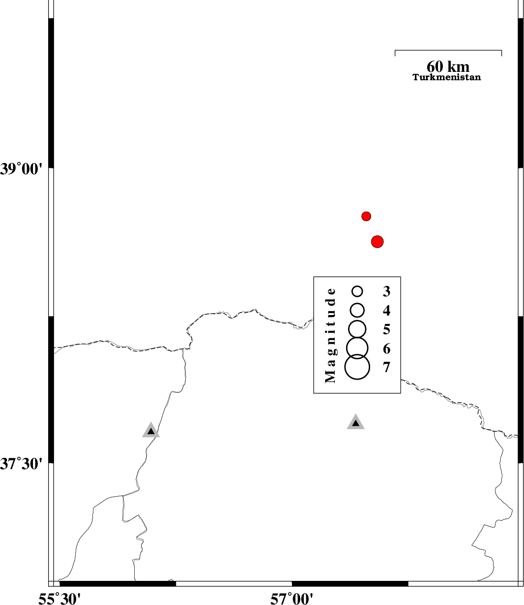 | 2011/12/11 | 04:17:20.9 | 07:47:20.9 | 38.39 | 56.96 | 6 | ML:2.7 | Turkmenistan, 94 km North of Ashkhaneh | ||