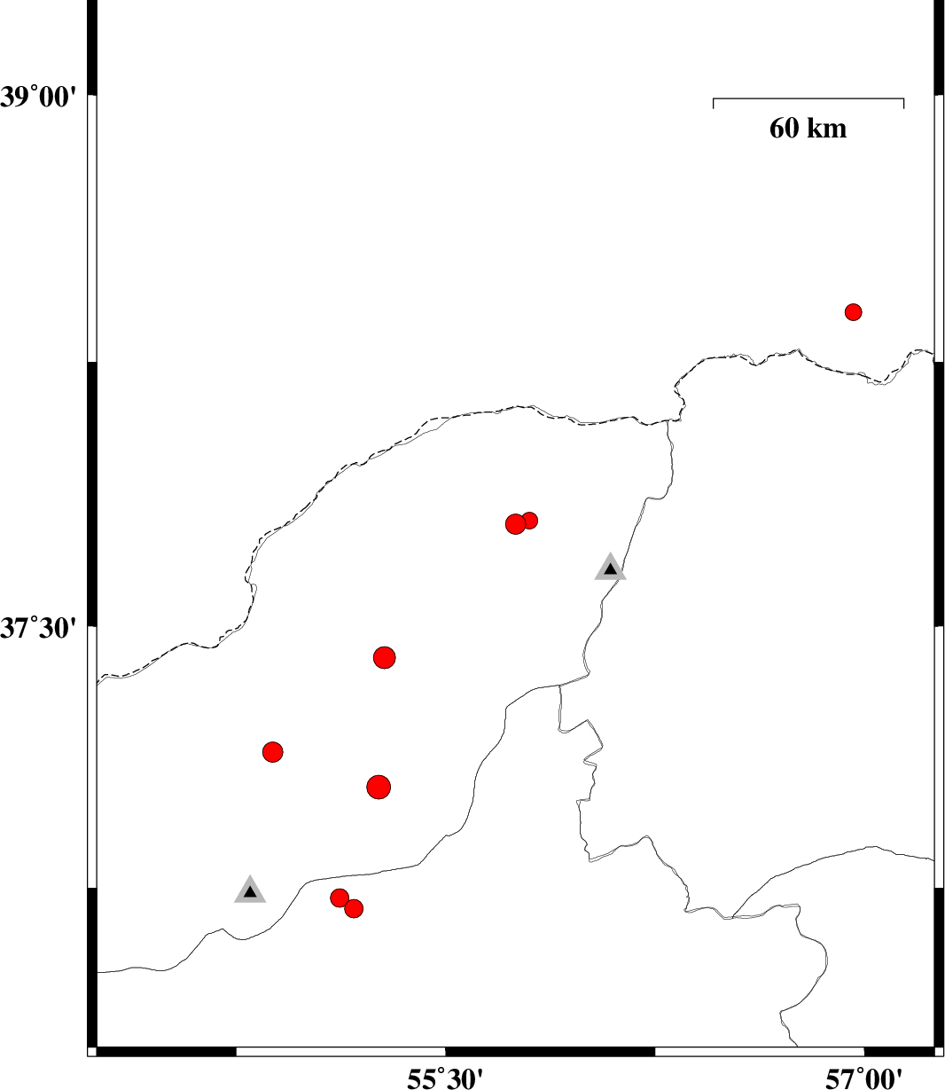 | 2011/12/01 | 03:56:42.1 | 07:26:42.1 | 37.8 | 55.8 | 6 | ML:2.7 | Golestan Province, 54 km North-East of Kalaleh | ||