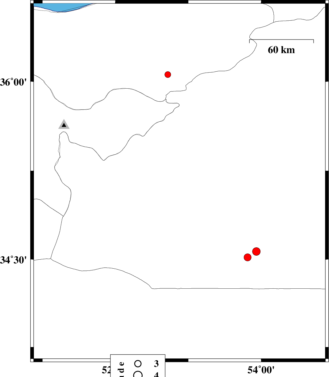 | 2011/12/23 | 22:43:26.8 | 02:13:26.8 | 35.1 | 53.07 | 32 | ML:3.4 | Semnan Province, 60 km South-West of Semnan | ||