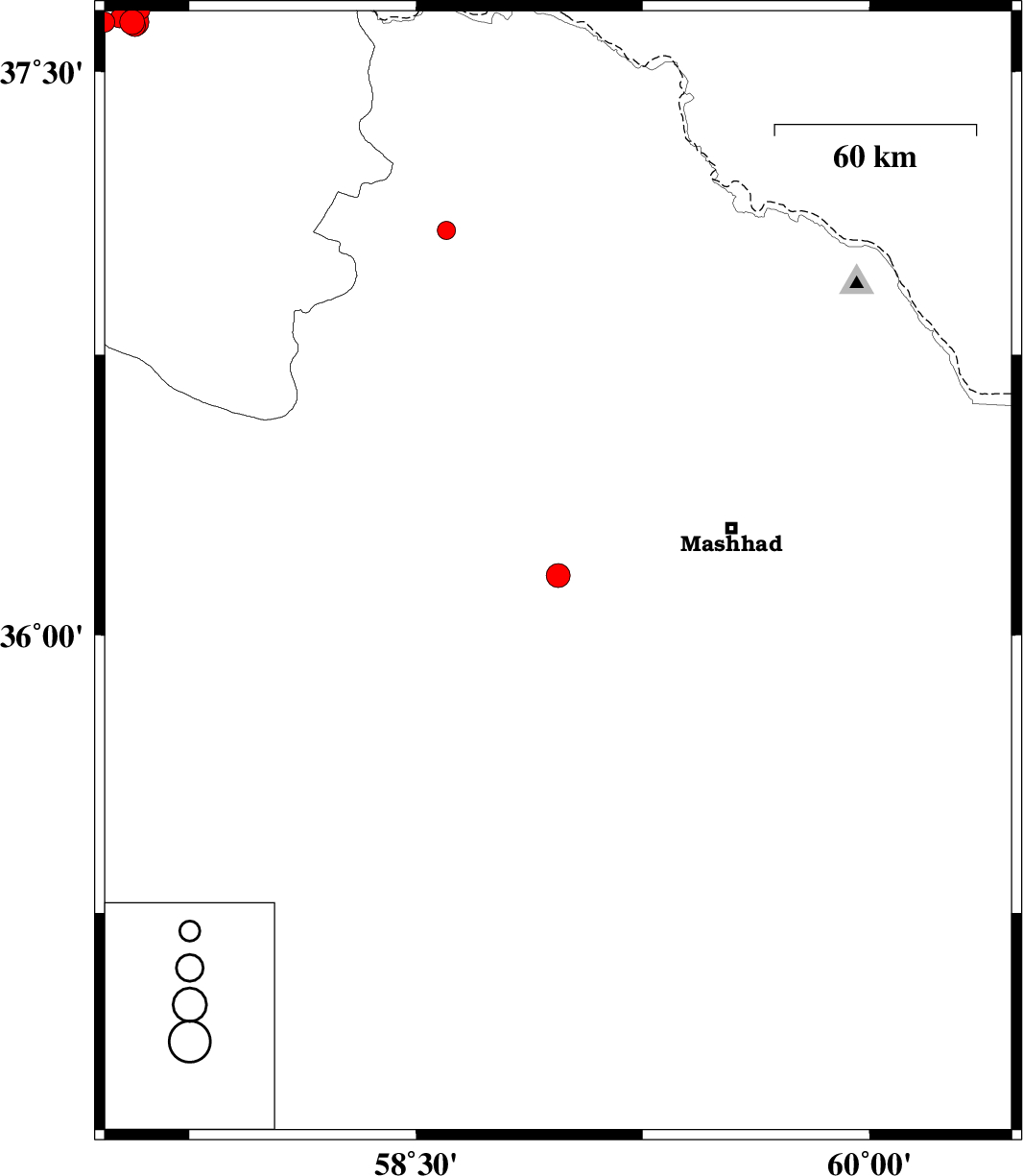 | 2011/12/24 | 22:56:20.4 | 02:26:20.4 | 37.08 | 58.6 | 6 | ML:2.7 | Khorasan(center) Province, 9 km Quchan |