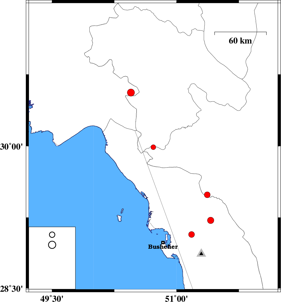 | 2011/12/05 | 06:12:45.0 | 09:42:45.0 | 29.22 | 51.41 | 3 | ML:3.5 | Bushehr Province, 20 km East of Borazjan |