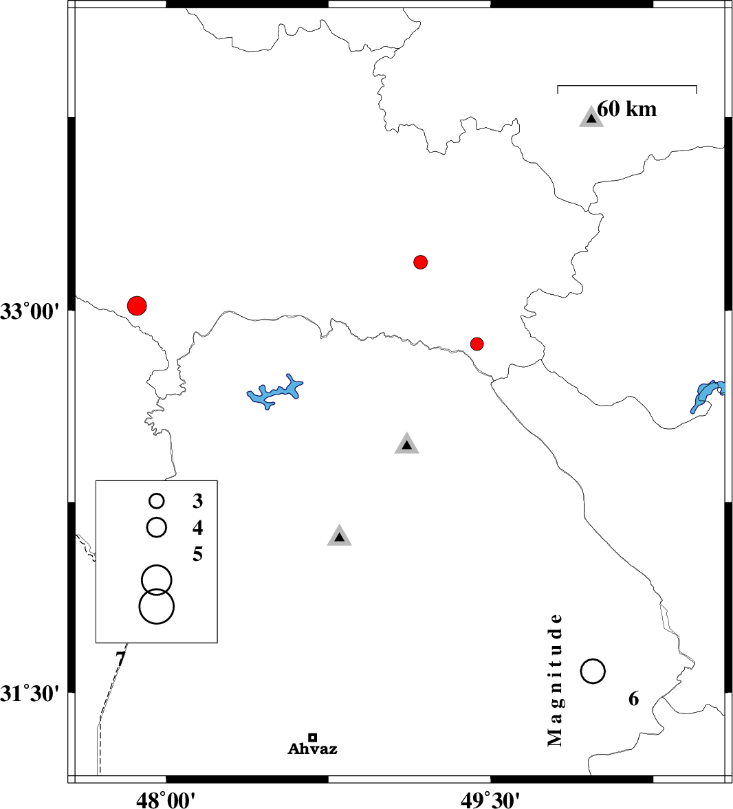 | 2011/12/26 | 04:01:20.2 | 07:31:20.2 | 32.35 | 49.34 | 32 | ML:2.7 | Khoozestan Province, 22 km East of Lali | ||