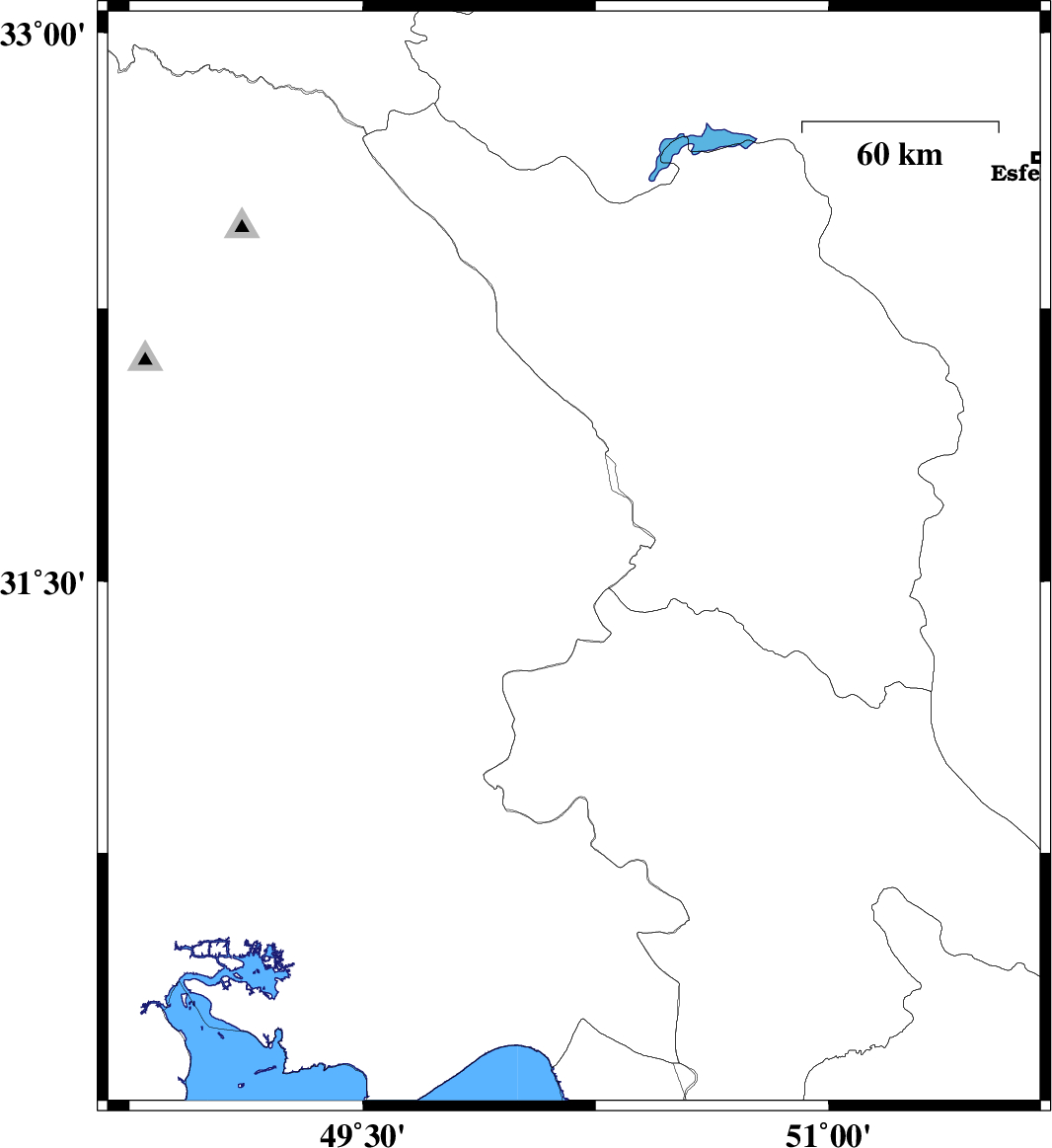 | 2012/01/04 | 03:09:11.3 | 06:39:11.3 | 31.56 | 50.18 | 15 | ML:3 | Khoozestan Province, 27 km East of Bagh Malek | ||