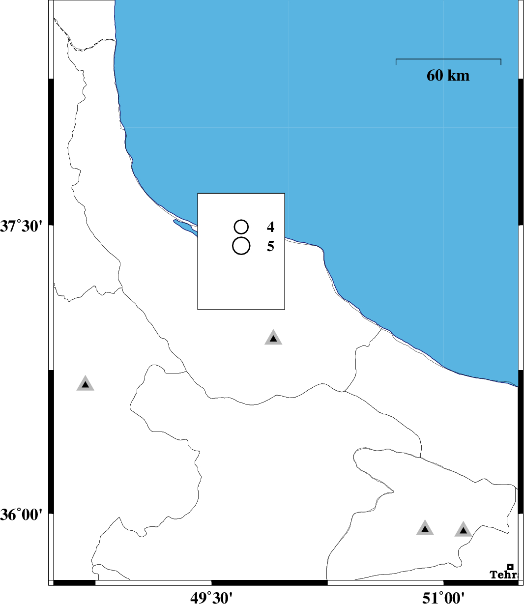 | 2011/12/30 | 00:25:14.8 | 03:55:14.8 | 37.02 | 49.59 | 15 | ML:2.5 | Gilan Province, 29 km South of Rasht | ||