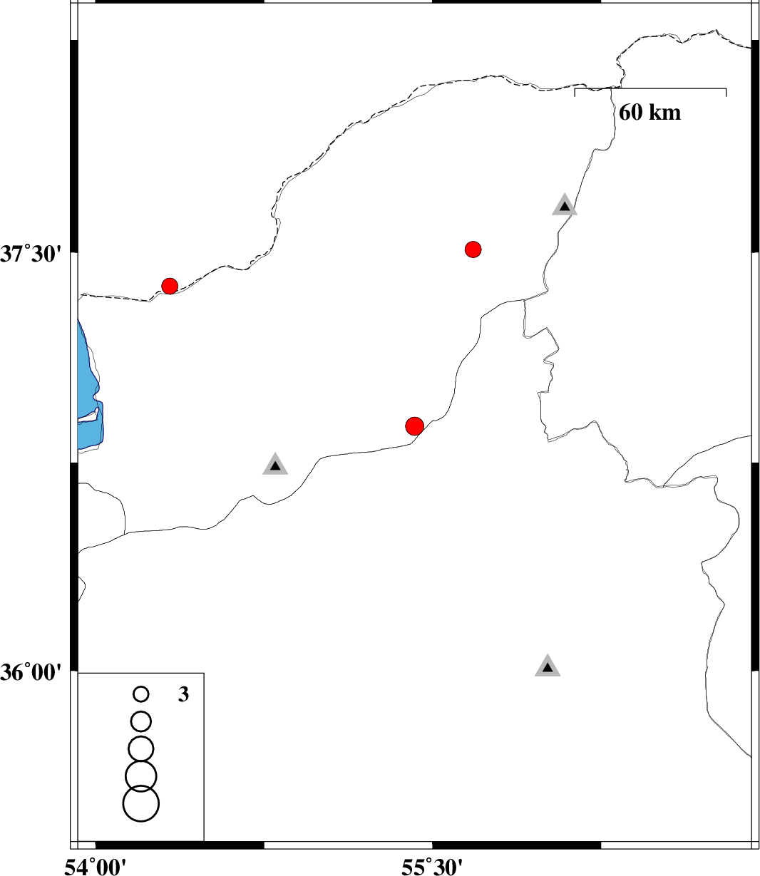 | 2012/01/07 | 15:12:23.2 | 18:42:23.2 | 36.88 | 55.42 | 14 | ML:3.6 | Golestan Province, 39 km South of Minodasht | ||