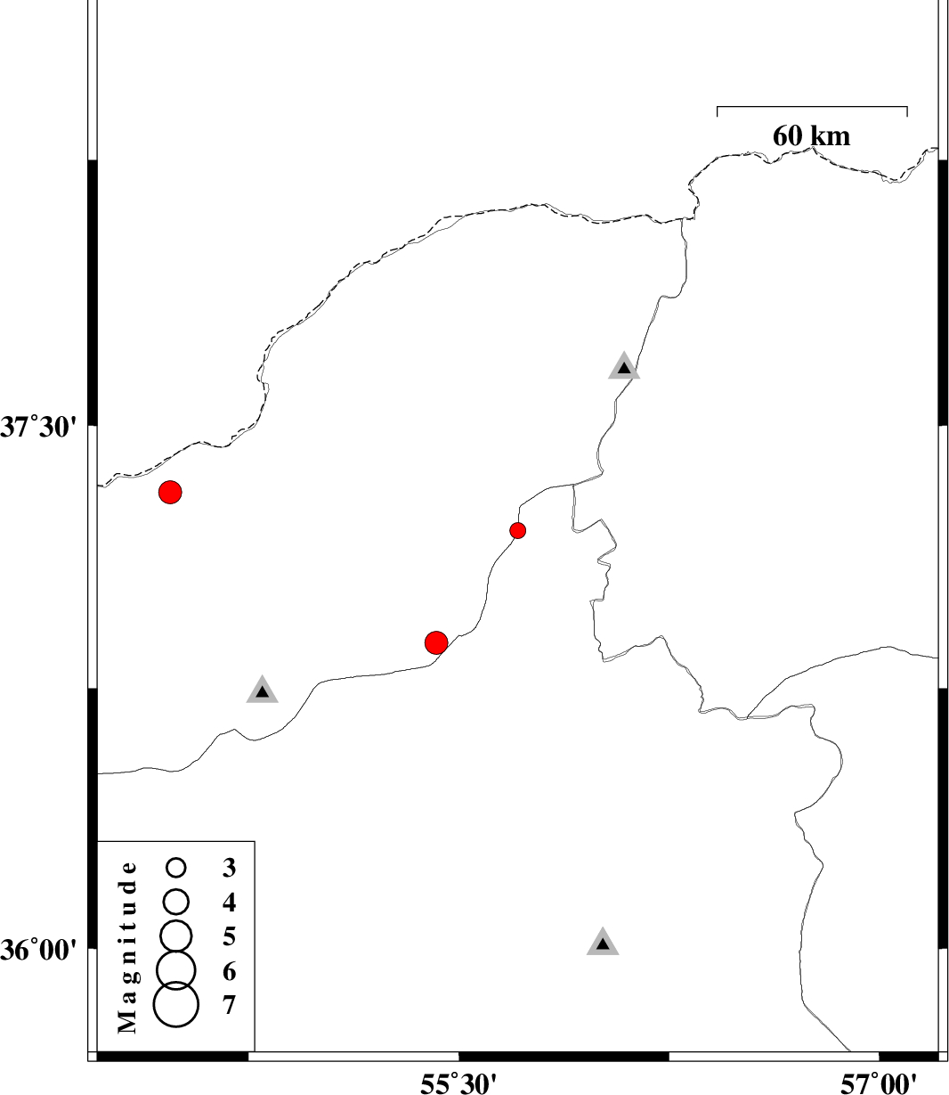 | 2012/01/07 | 15:12:23.2 | 18:42:23.2 | 36.88 | 55.42 | 14 | ML:3.6 | Golestan Province, 39 km South of Minodasht |
