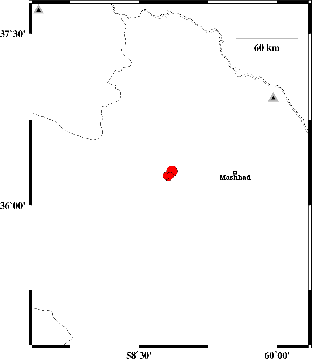 | 2012/01/19 | 17:42:25.2 | 21:12:25.2 | 36.26 | 58.8 | 14 | ML:3.6 | Khorasan(center) Province, 6 km Neyshabur | ||
