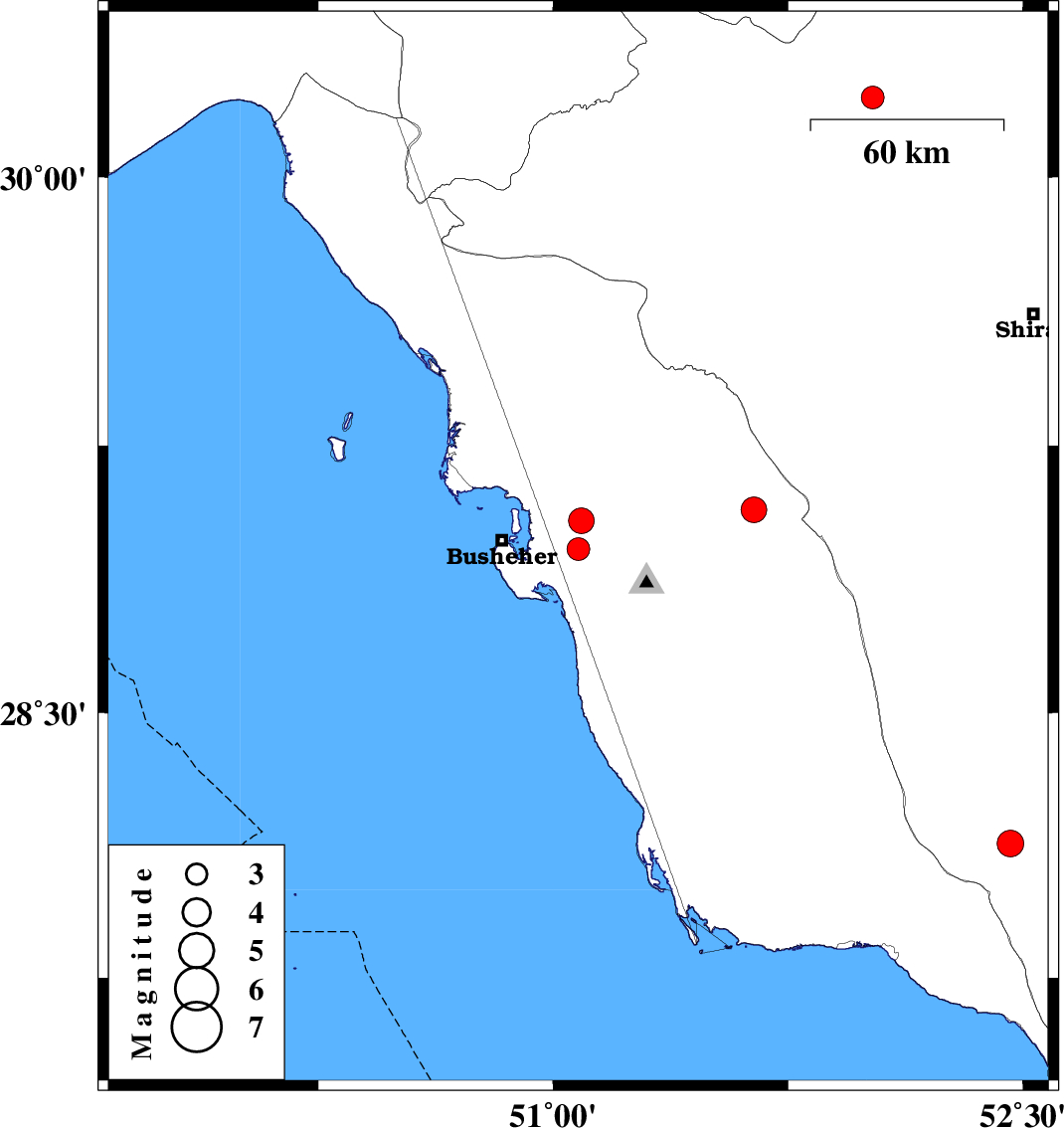 | 2012/01/25 | 16:18:25.8 | 19:48:25.8 | 29.04 | 51.09 | 12 | ML:3.7 | Bushehr Province, 26 km East of Busheher | ||