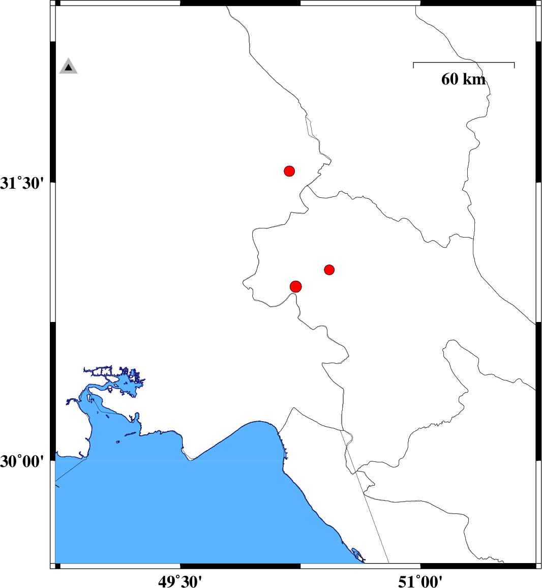 | 2012/01/04 | 03:09:11.3 | 06:39:11.3 | 31.56 | 50.18 | 15 | ML:3 | Khoozestan Province, 27 km East of Bagh Malek |