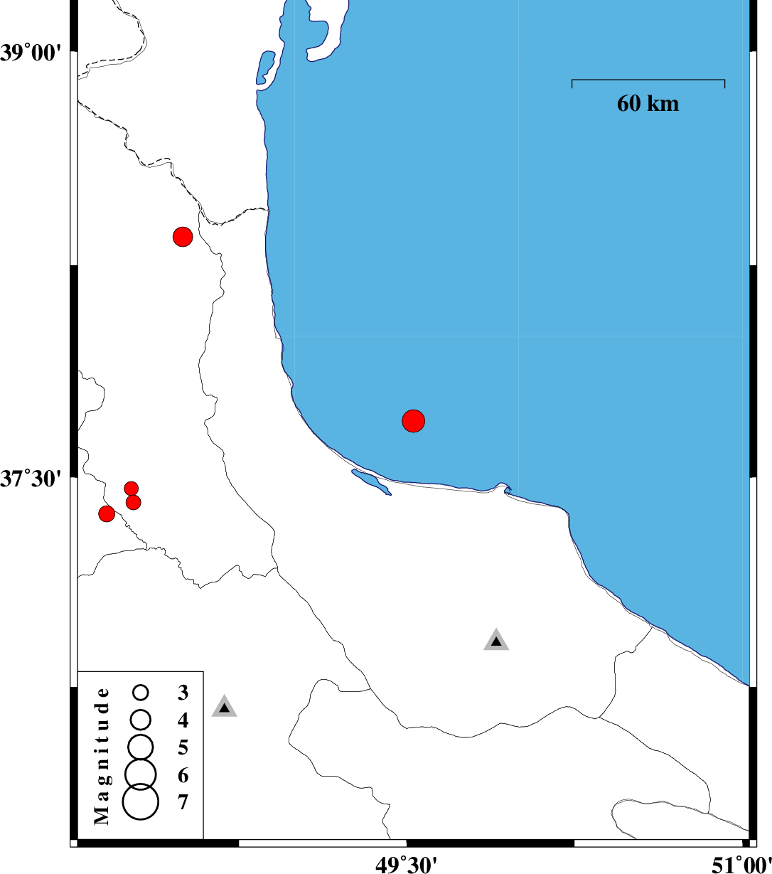 | 2012/02/04 | 20:04:14.0 | 23:34:14.0 | 37.7 | 49.53 | 40 | ML:4.5 | Caspian Sea, 26 km North of Bandar-e anzali | ||