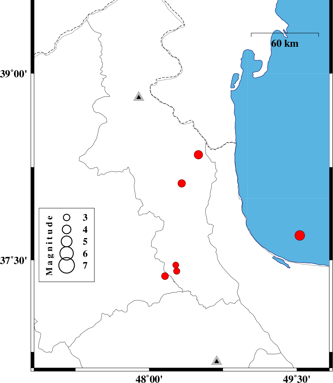 | 2012/02/04 | 20:04:14.0 | 23:34:14.0 | 37.7 | 49.53 | 40 | ML:4.5 | Caspian Sea, 26 km North of Bandar-e anzali | ||