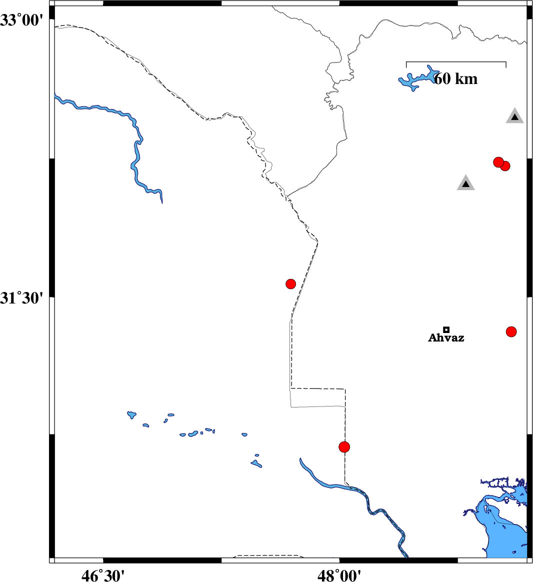 | 2012/02/23 | 15:54:18.0 | 19:24:18.0 | 31.57 | 47.69 | 41 | ML:2.8 | Iraq, 47 km West of Susangerd | ||