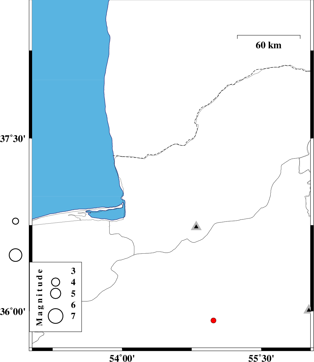 | 2012/02/13 | 15:09:44.6 | 18:39:44.6 | 36.85 | 55.39 | 14 | ML:3.5 | Golestan Province, 42 km South of Minodasht | ||