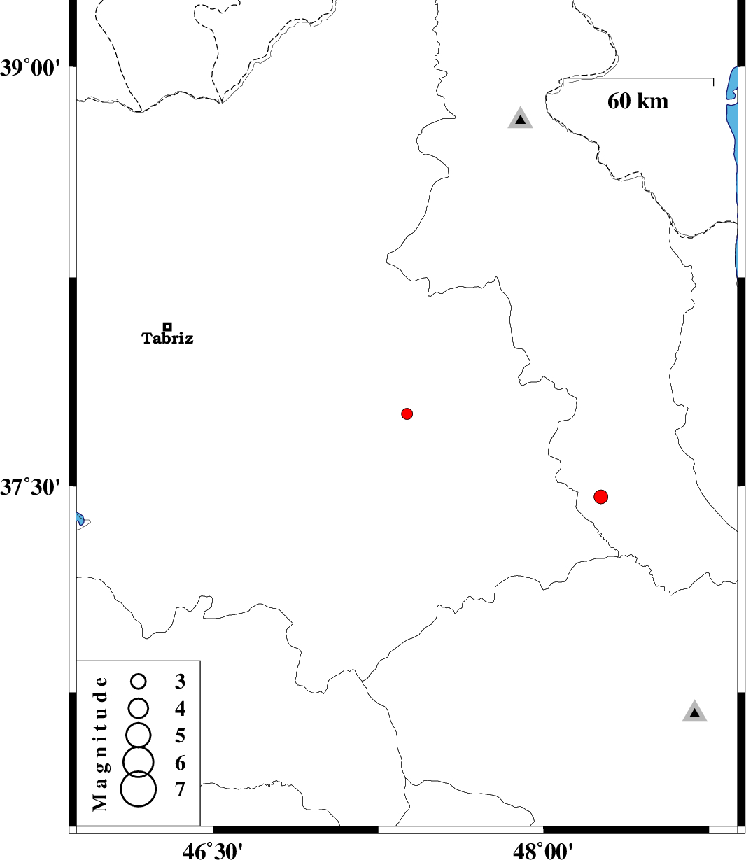 | 2012/03/03 | 15:00:42.5 | 18:30:42.5 | 37.76 | 47.38 | 59 | ML:2.3 | Azarbaijan Sharghi Province, 24 km South-West of Sarab | ||