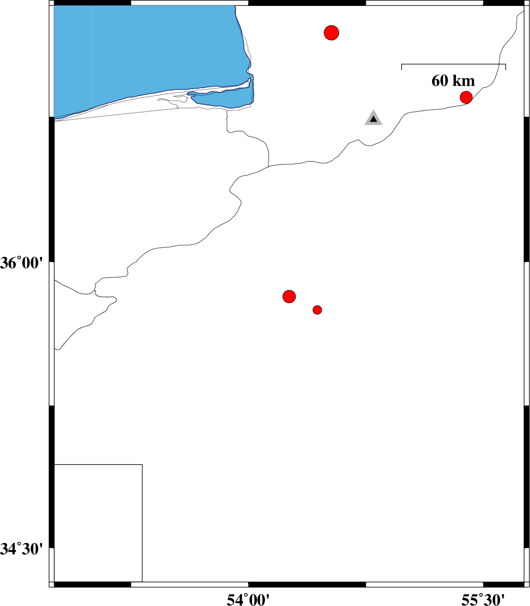 | 2012/03/06 | 06:34:25.3 | 10:04:25.3 | 35.82 | 54.26 | 16 | ML:3.6 | Semnan Province, 39 km South of Damghan | ||