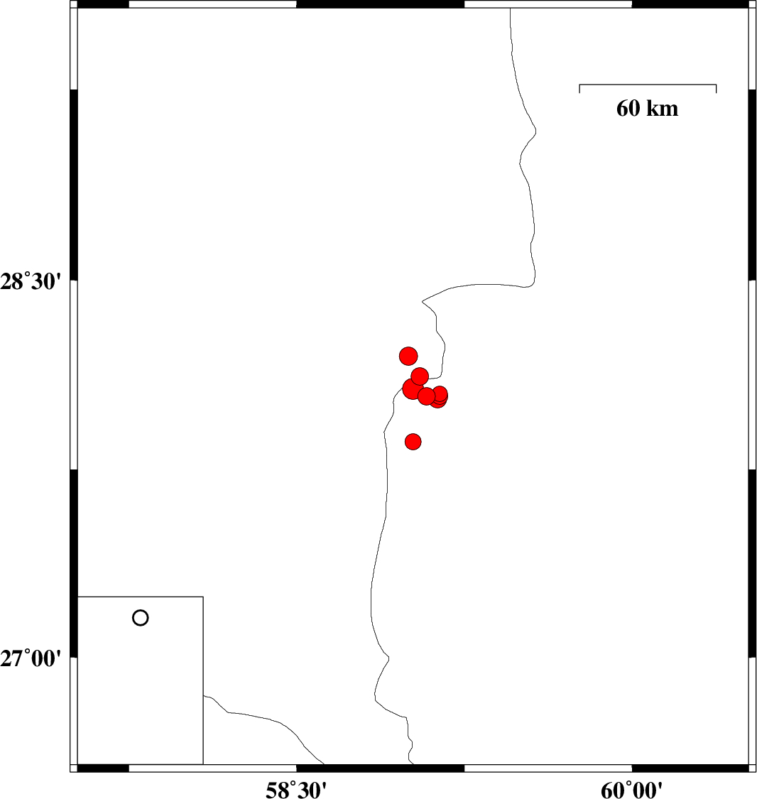 | 2012/03/10 | 15:15:44.1 | 18:45:44.1 | 28.04 | 59.14 | 15 | ML:3.2 | Sistan va Baloochestan Province, 142 km East of Kahnuj | ||