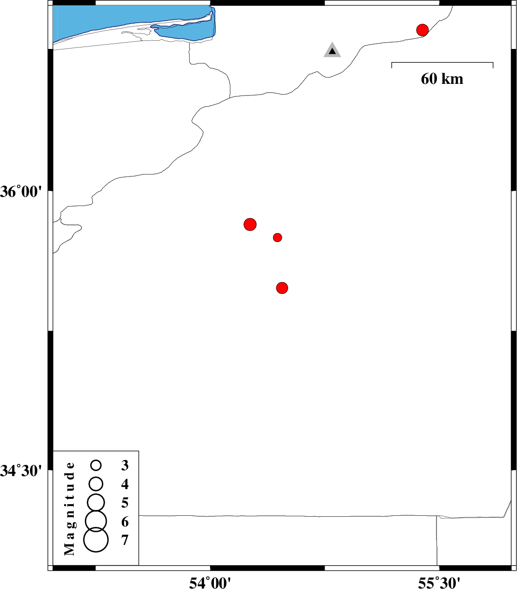 | 2012/02/13 | 15:09:44.6 | 18:39:44.6 | 36.85 | 55.39 | 14 | ML:3.5 | Golestan Province, 42 km South of Minodasht |