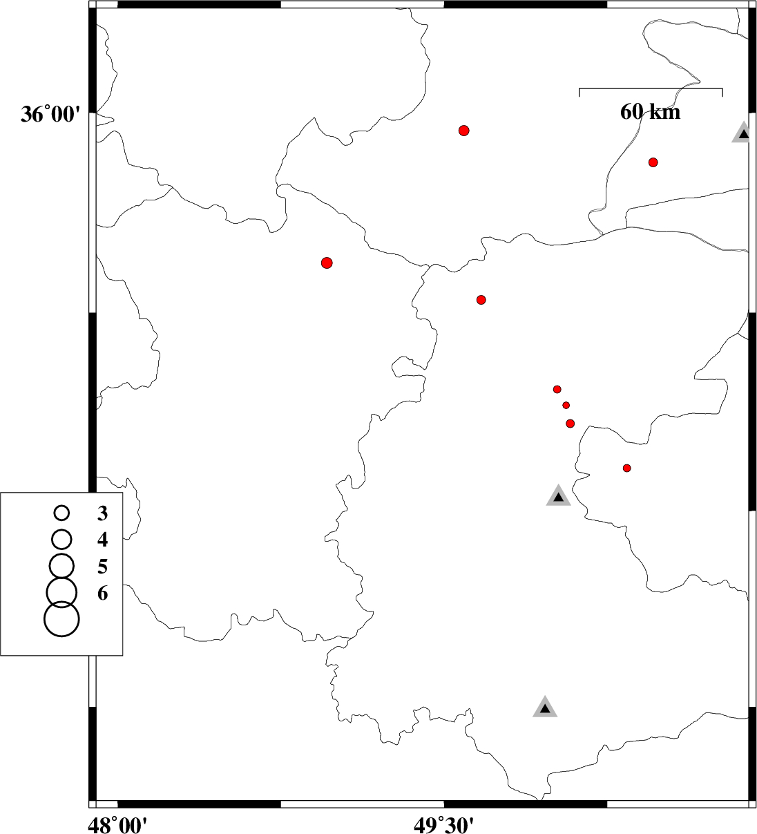 | 2012/03/08 | 04:05:38.2 | 07:35:38.2 | 34.75 | 50.11 | 18 | ML:1.9 | Markazi Province, 10 km Tafresh |