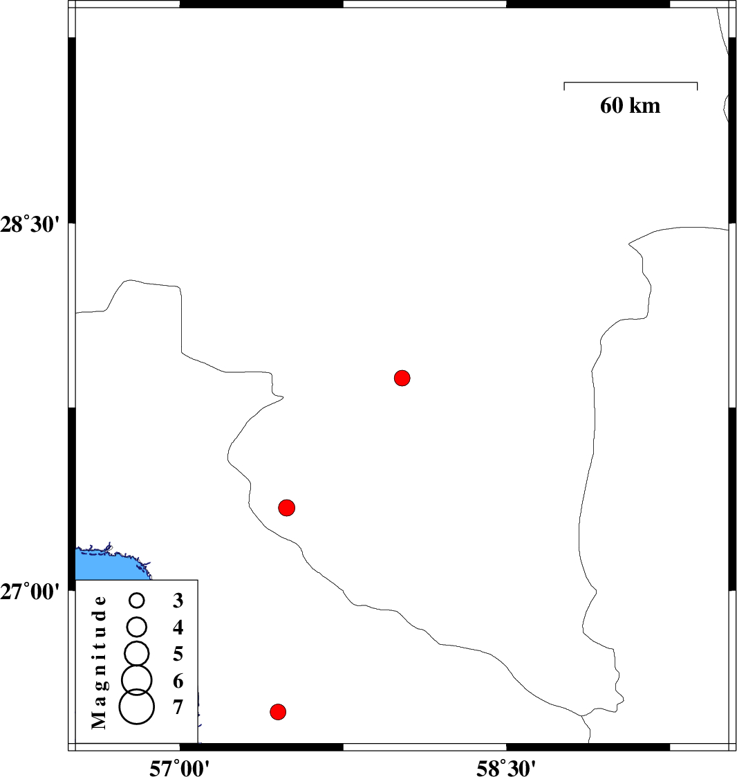 | 2012/03/19 | 07:06:09.0 | 10:36:09.0 | 27.87 | 58.02 | 14 | ML:3.2 | Kerman Province, 34 km East of Kahnuj | ||