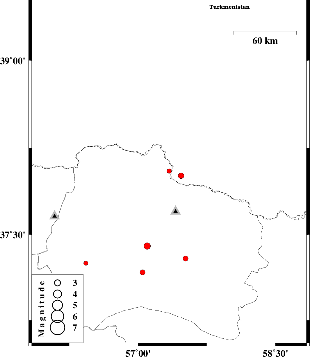 | 2012/03/10 | 15:54:28.6 | 19:24:28.6 | 37.4 | 57.1 | 15 | ML:3.2 | Khorasan(north) Province, 22 km West of Bojnurd | ||