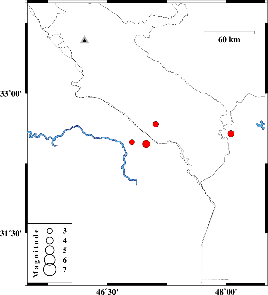 | 2012/03/19 | 04:29:55.1 | 07:59:55.1 | 32.48 | 46.81 | 18 | ML:3 | Iraq, 48 km South-West of Dehloran |