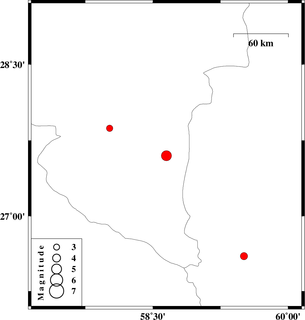 | 2012/03/19 | 07:06:09.0 | 10:36:09.0 | 27.87 | 58.02 | 14 | ML:3.2 | Kerman Province, 34 km East of Kahnuj |