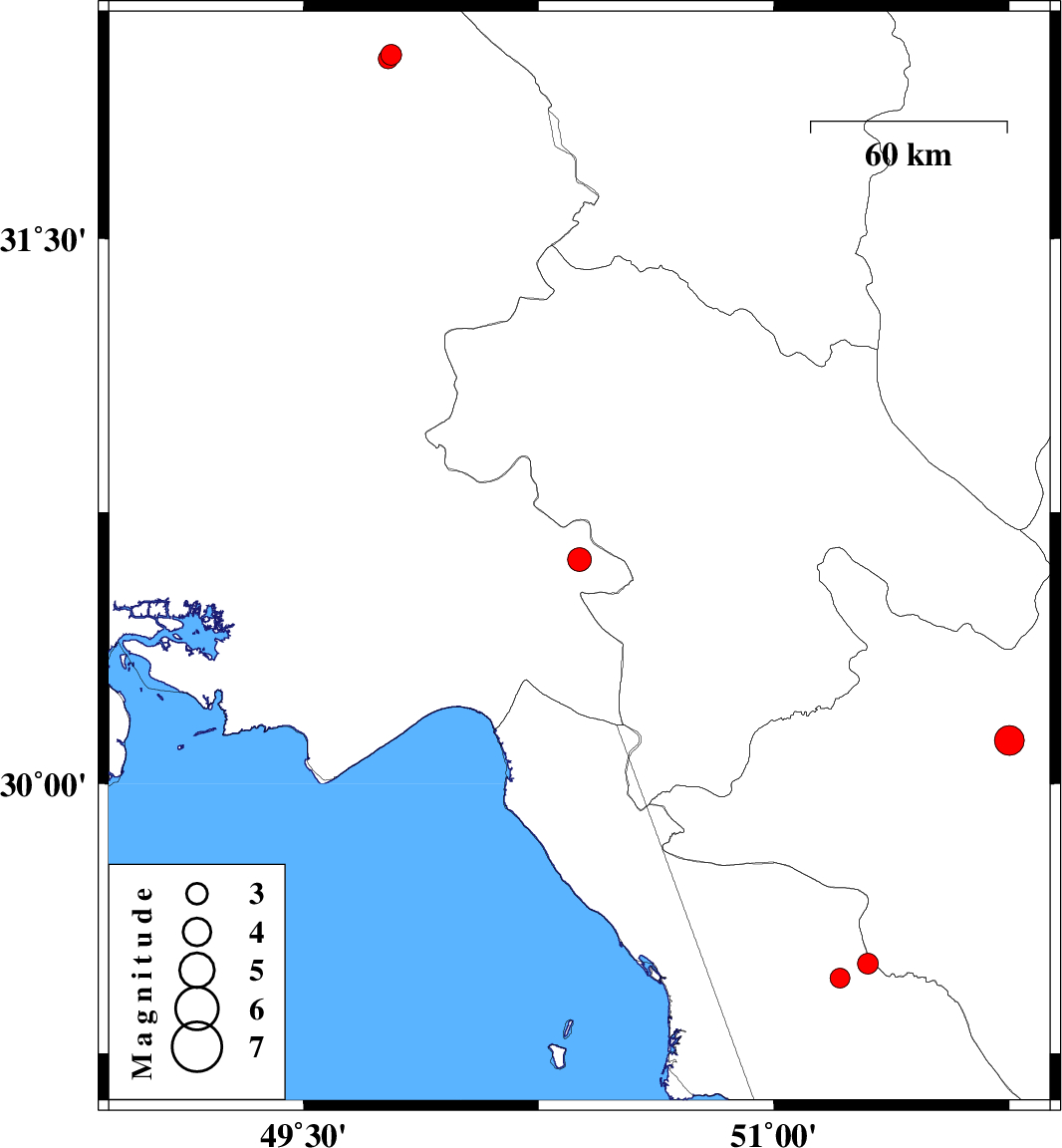| 2012/03/06 | 20:09:54.8 | 23:39:54.8 | 29.46 | 51.21 | 45 | ML:2.8 | Bushehr Province, 22 km North of Borazjan | ||