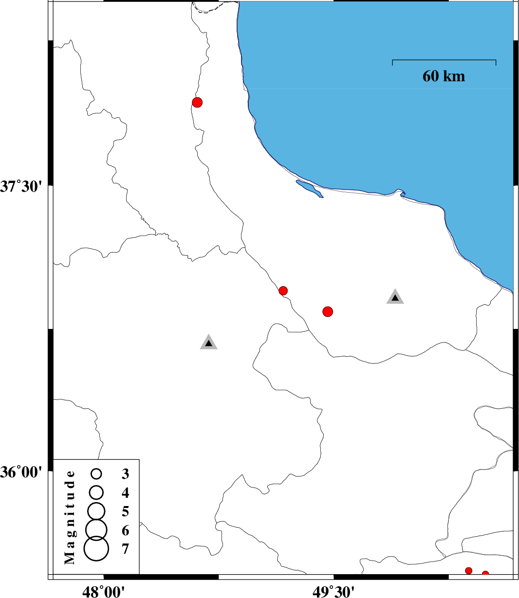 | 2012/04/04 | 01:27:00.9 | 05:57:00.9 | 37.93 | 48.61 | 14 | ML:2.9 | Gilan Province, 34 km North of Khalkhal |