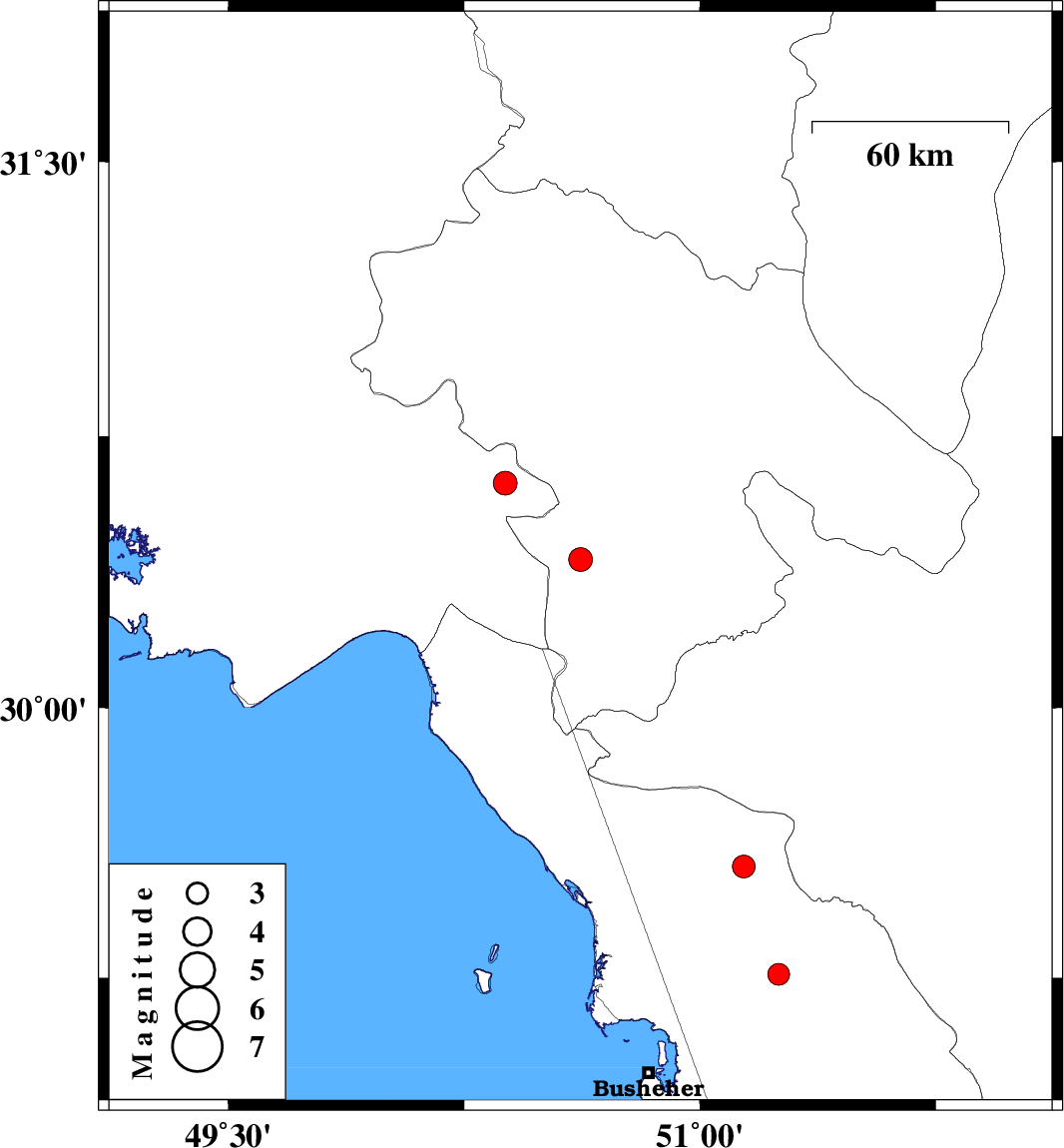 | 2012/03/29 | 04:30:55.5 | 09:00:55.5 | 29.56 | 51.14 | 14 | ML:3.2 | Bushehr Province, 34 km North of Borazjan | ||