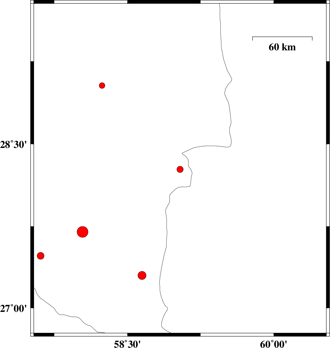 | 2012/05/11 | 00:38:00.3 | 05:08:00.3 | 28.27 | 59.04 | 14 | ML:2.9 | Kerman Province, 114 km South-East of Bam | ||