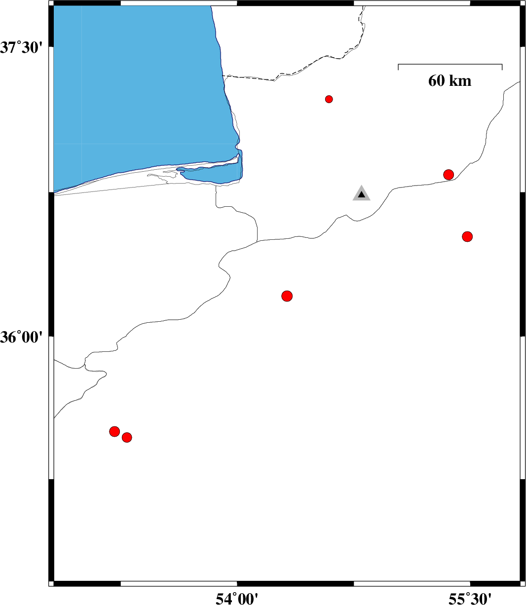 | 2012/05/17 | 07:51:20.6 | 12:21:20.6 | 36.84 | 55.36 | 8 | ML:2.9 | Golestan Province, 27 km South-East of Ramian | ||