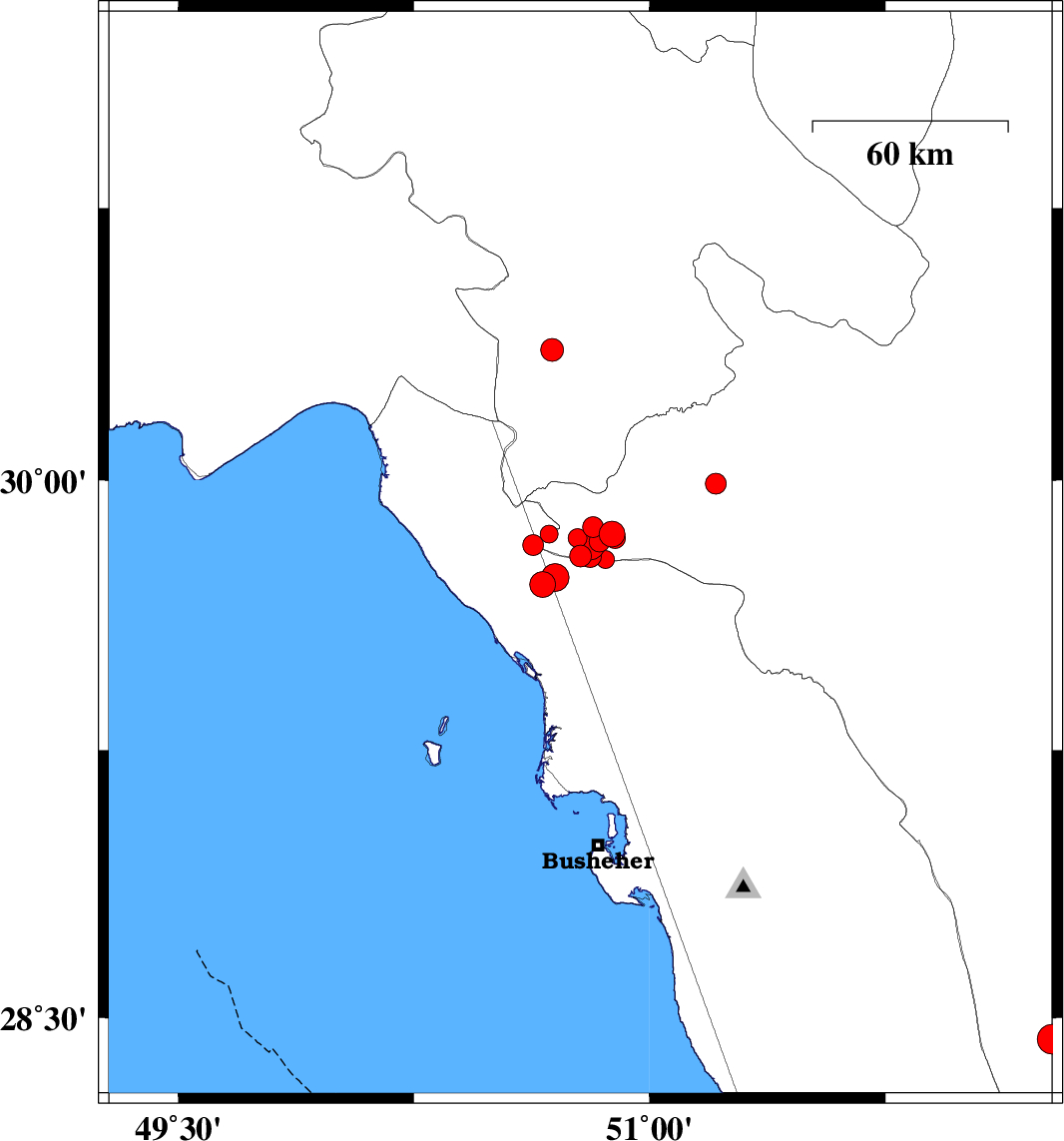 2012/06/04 19:04:19.9 23:34:19.9 29.8250.6346 ML:2.9 Bushehr Province, 29 km North-East of Bandar-e genaveh