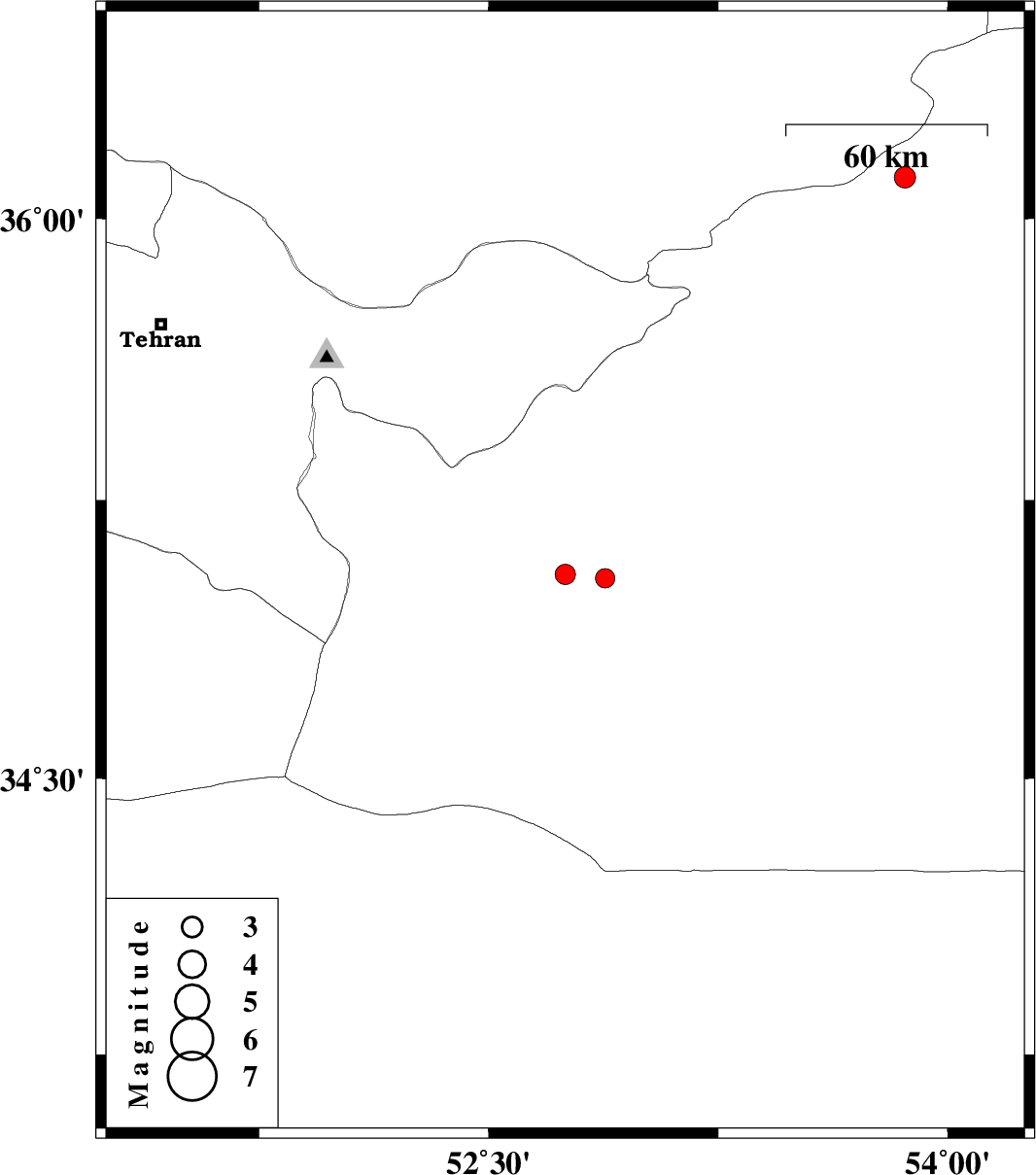 | 2012/06/03 | 17:00:57.7 | 21:30:57.7 | 35.04 | 52.88 | 25 | ML:2.8 | Semnan Province, 53 km South-East of Garmsar |