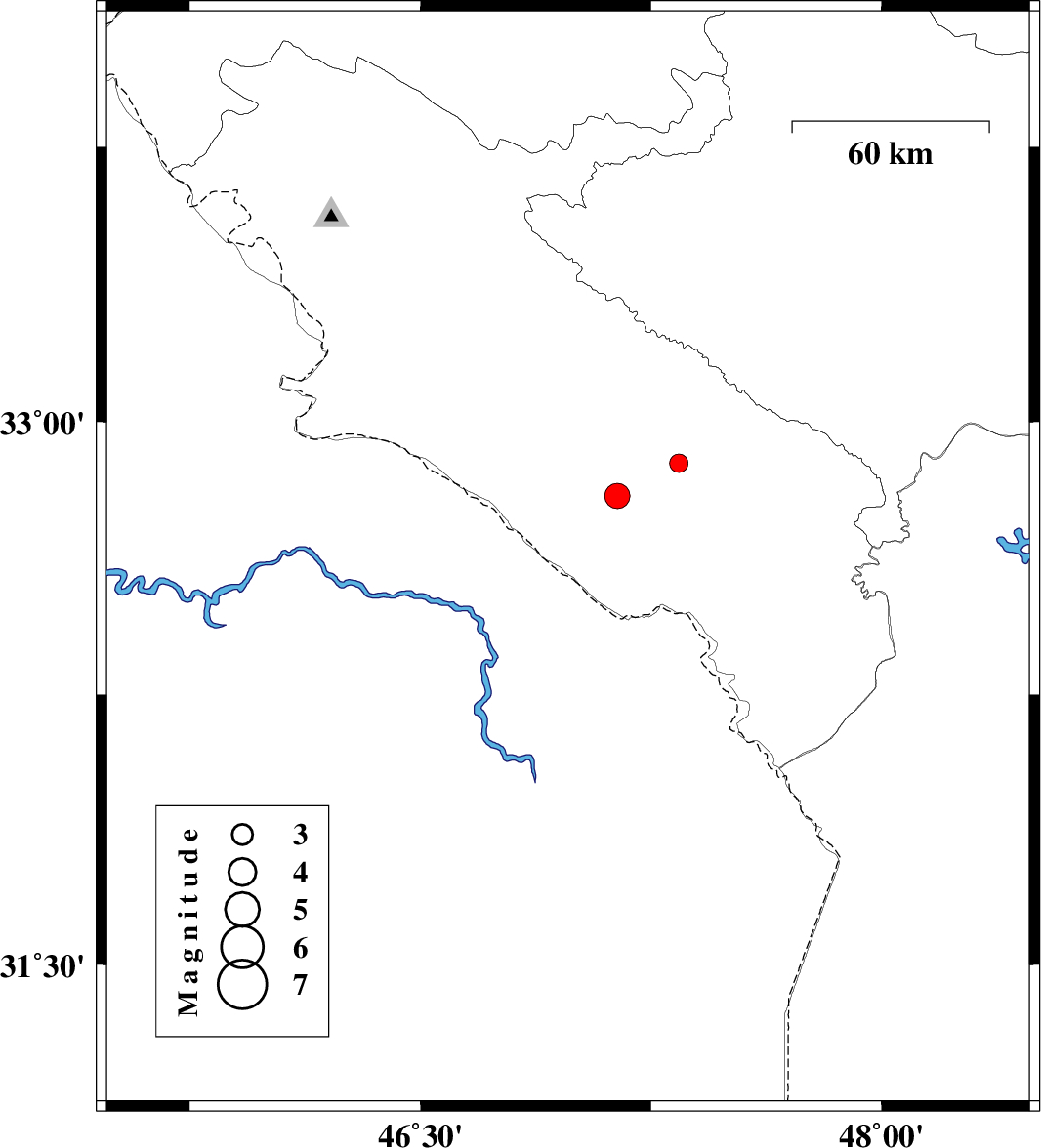 | 2012/06/08 | 05:32:29.9 | 10:02:29.9 | 32.62 | 46.98 | 18 | ML:3.7 | Ilam Province, 27 km West of Dehloran | ||
