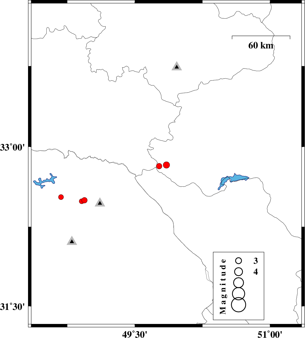 | 2012/06/08 | 15:17:55.8 | 19:47:55.8 | 32.83 | 49.85 | 14 | ML:3.3 | Esfahan Province, 27 km South-West of Fereydunshahr | ||