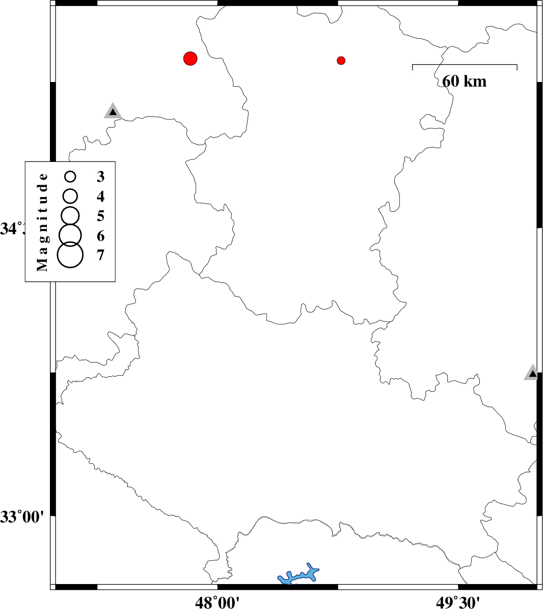 | 2012/06/21 | 14:37:14.8 | 19:07:14.8 | 33.8 | 48.96 | 43 | ML:2.2 | Lorestan Province, 22 km East of Borujerd |