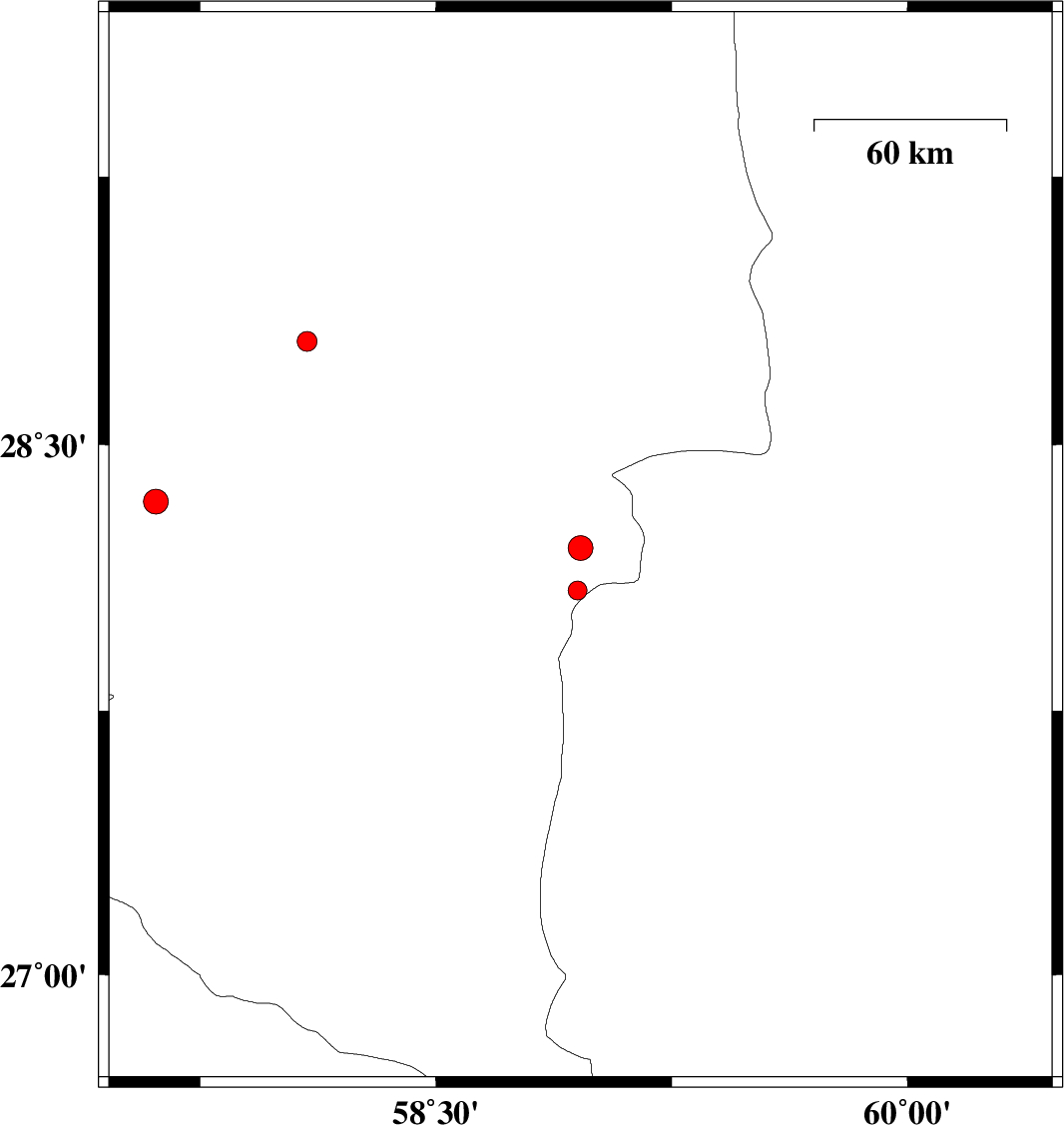 | 2012/06/28 | 11:27:37.5 | 15:57:37.5 | 28.21 | 58.96 | 15 | ML:3.5 | Kerman Province, 116 km South-East of Bam | ||