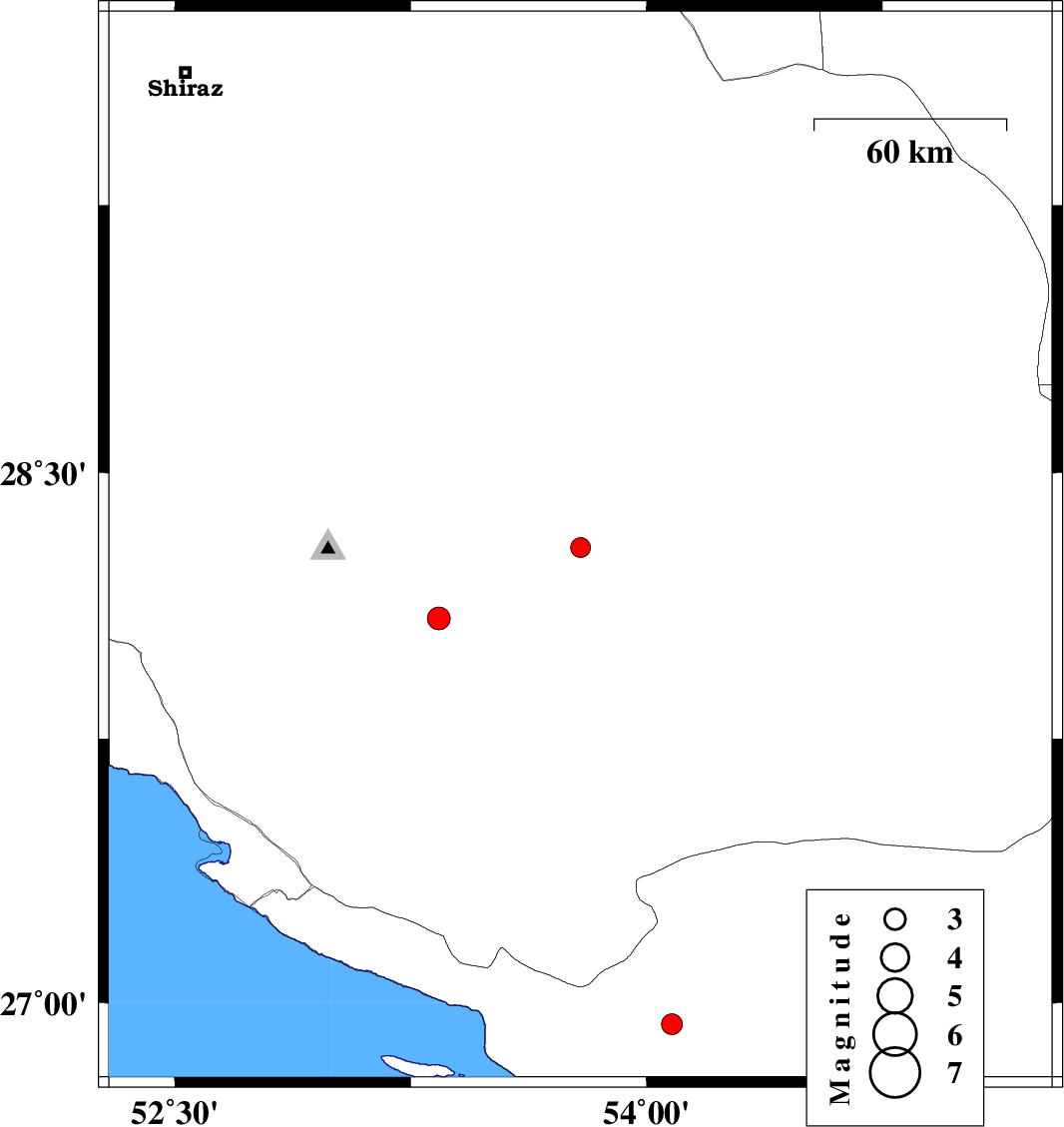 | 2012/06/23 | 09:03:25.9 | 13:33:25.9 | 28.09 | 53.34 | 6 | ML:3.2 | Fars Province, 50 km South-West of Jahrom |