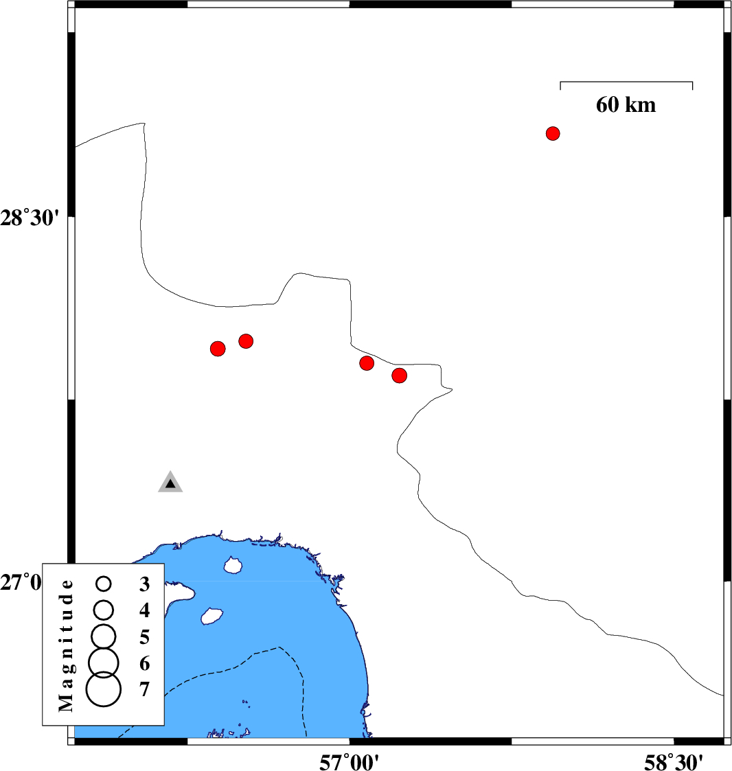 | 2012/06/29 | 12:28:13.6 | 16:58:13.6 | 27.91 | 56.54 | 14 | ML:3.1 | Hormozgan Province, 85 km North-East of Bandar-e abbas | ||