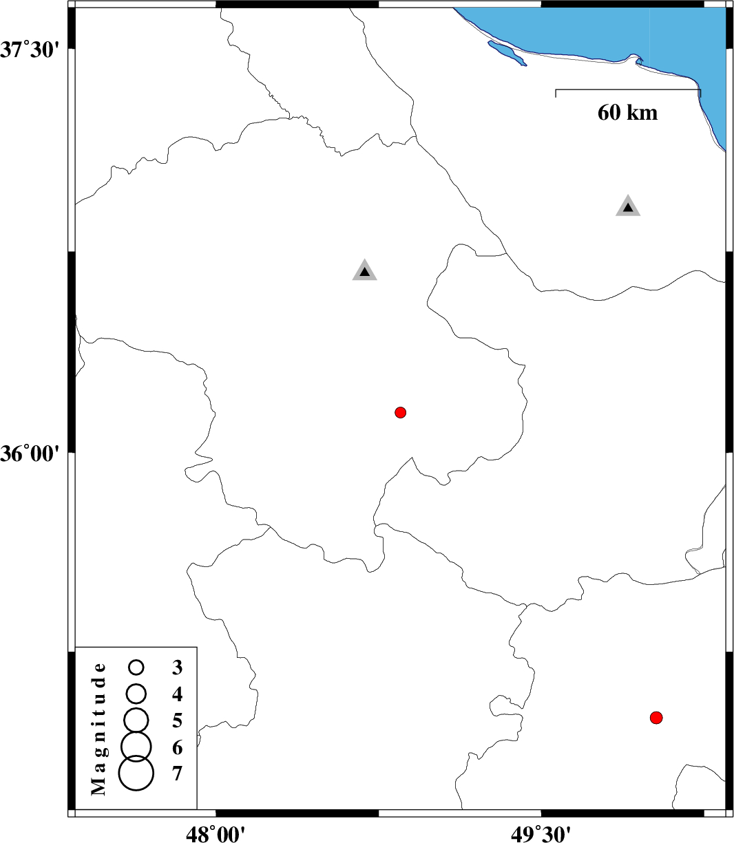 | 2012/07/03 | 21:42:40.7 | 02:12:40.7 | 36.15 | 48.85 | 14 | ML:2.2 | Zanjan Province, 23 km East of Qeydar | ||