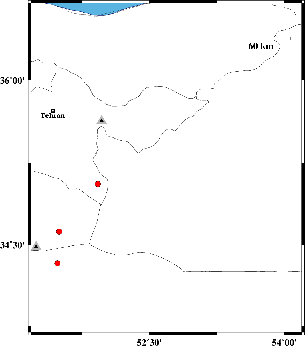 | 2012/07/19 | 08:17:01.3 | 12:47:01.3 | 35.19 | 52.69 | 25 | ML:2.8 | Semnan Province, 32 km East of Garmsar | ||