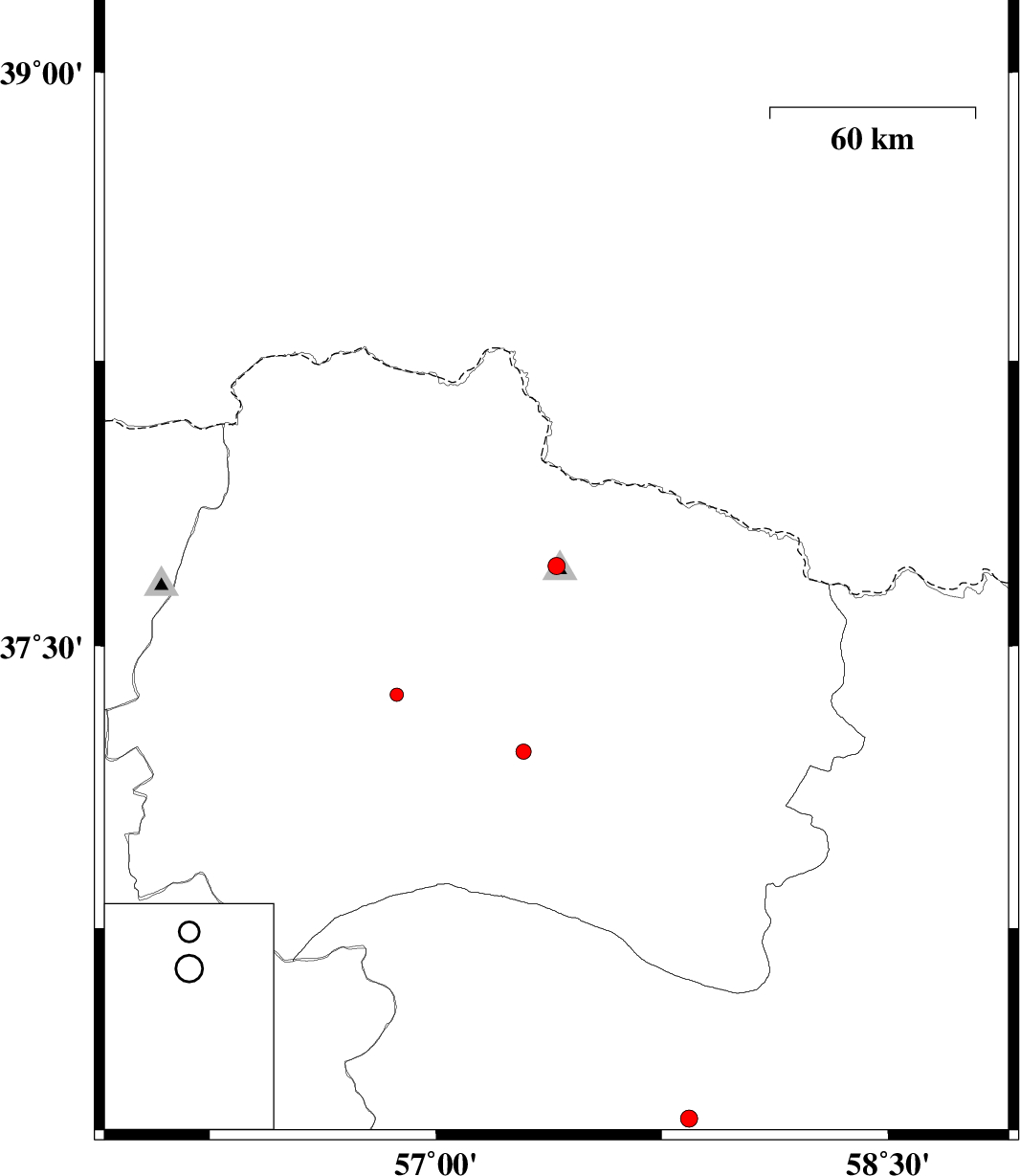 | 2012/07/20 | 17:57:10.3 | 22:27:10.3 | 37.37 | 56.87 | 37 | ML:2 | Khorasan(north) Province, 21 km South of Ashkhaneh | ||
