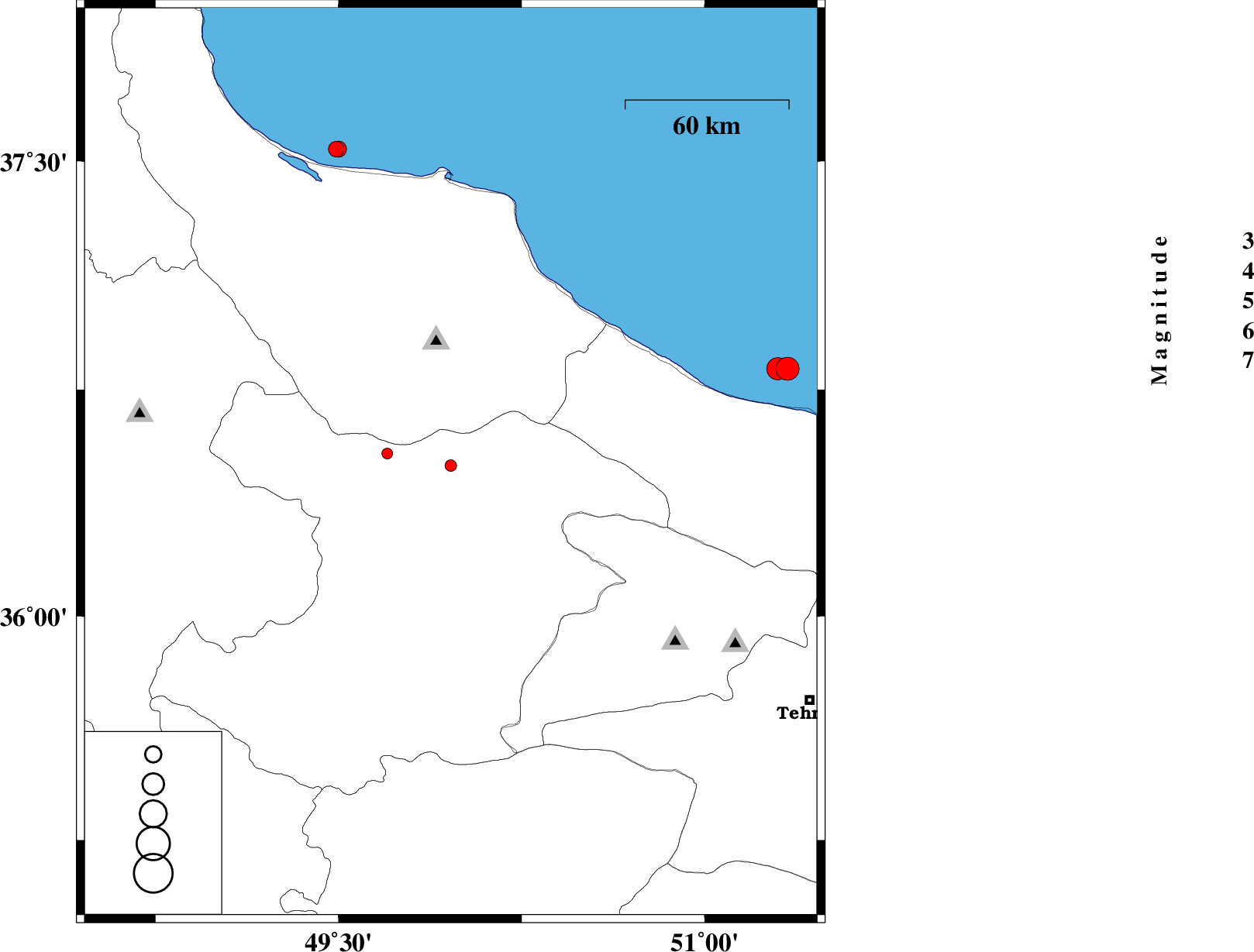 | 2012/07/27 | 21:19:26.9 | 01:49:26.9 | 36.82 | 51.3 | 6 | ML:4.1 | Caspian Sea, 22 km North-West of Chalus | ||