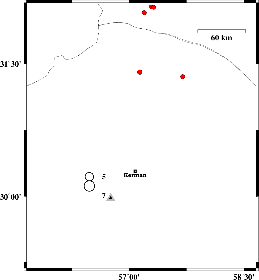 | 2012/08/02 | 09:41:29.9 | 14:11:29.9 | 31.4 | 56.66 | 14 | ML:2.5 | Kerman Province, 21 km North-West of Ravar | ||
