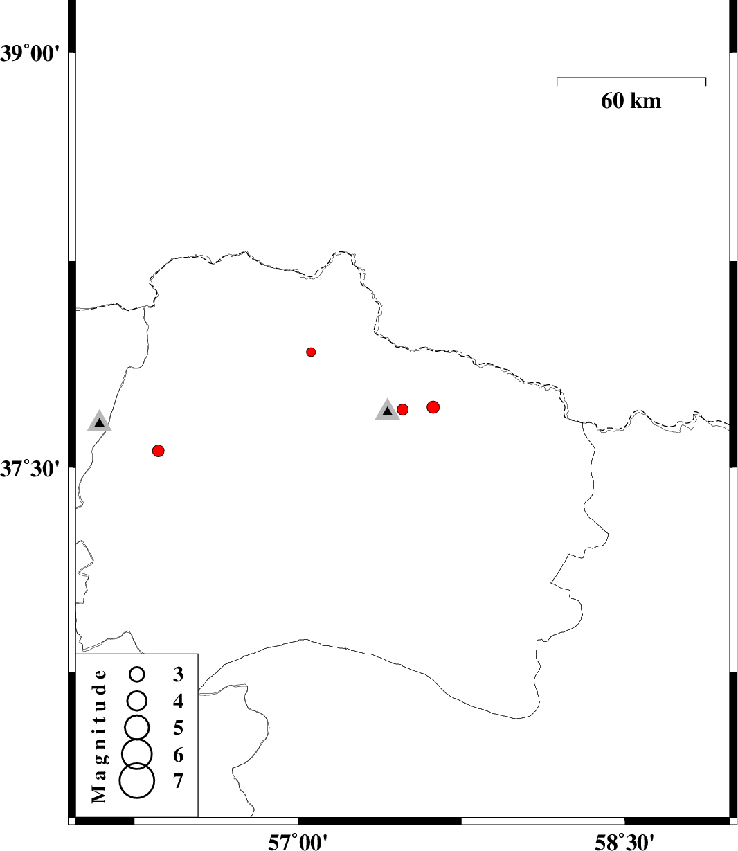 | 2012/07/26 | 07:13:44.7 | 11:43:44.7 | 37.72 | 57.62 | 29 | ML:2.6 | Khorasan(north) Province, 37 km North-East of Bojnurd |