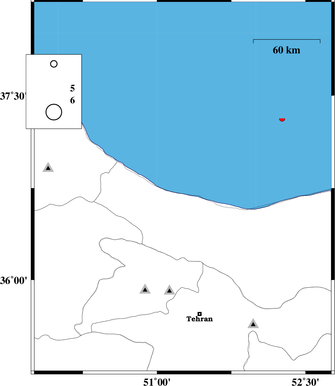 | 2012/07/27 | 21:19:26.9 | 01:49:26.9 | 36.82 | 51.3 | 6 | ML:4.1 | Caspian Sea, 22 km North-West of Chalus | ||