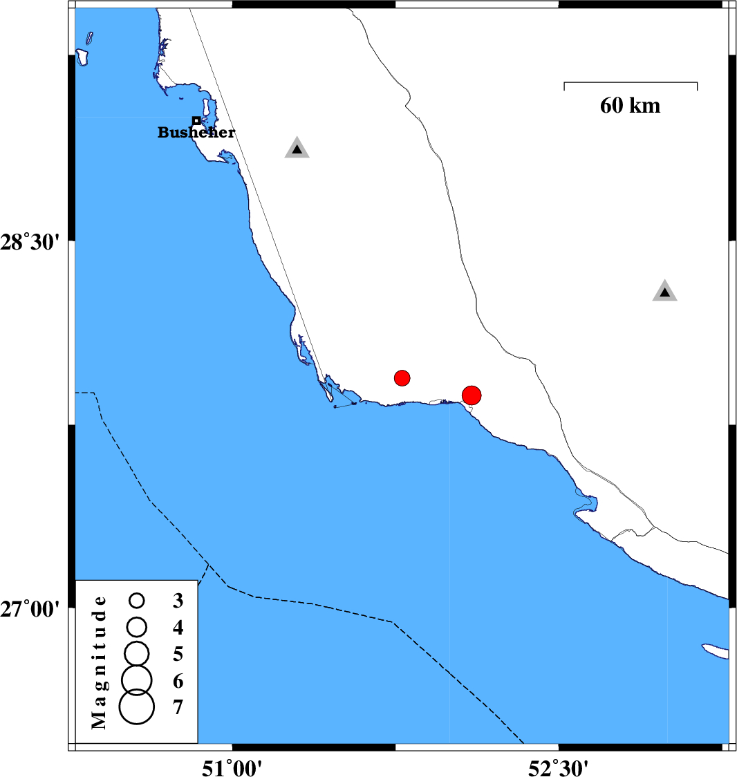 | 2012/08/18 | 19:17:31.6 | 23:47:31.6 | 27.87 | 52.1 | 37 | ML:4 | Bushehr Province, 6 km Bandar-e kangan |