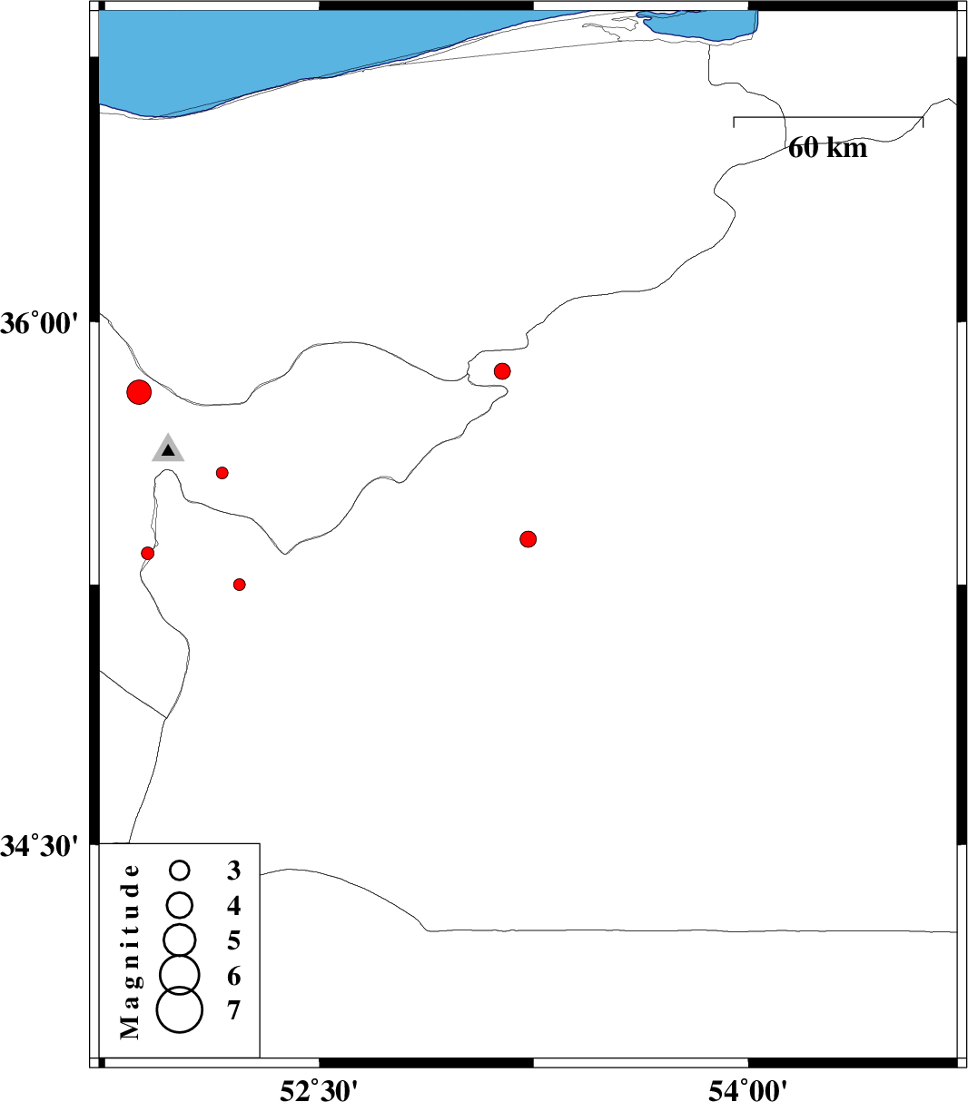 | 2012/08/17 | 20:31:26.6 | 01:01:26.6 | 35.8 | 51.87 | 9 | ML:3.8 | Tehran Province, 21 km West of Damavand | ||