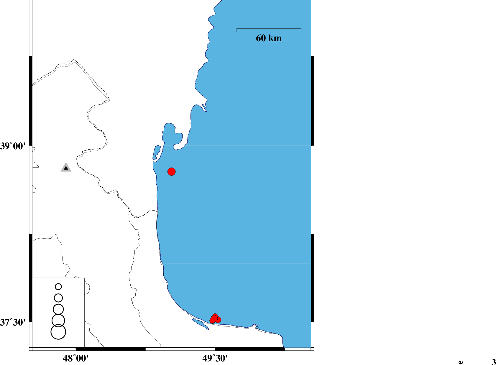 | 2012/08/02 | 11:06:03.5 | 15:36:03.5 | 37.52 | 49.53 | 14 | ML:3 | Caspian Sea, 8 km Bandar-e anzali |