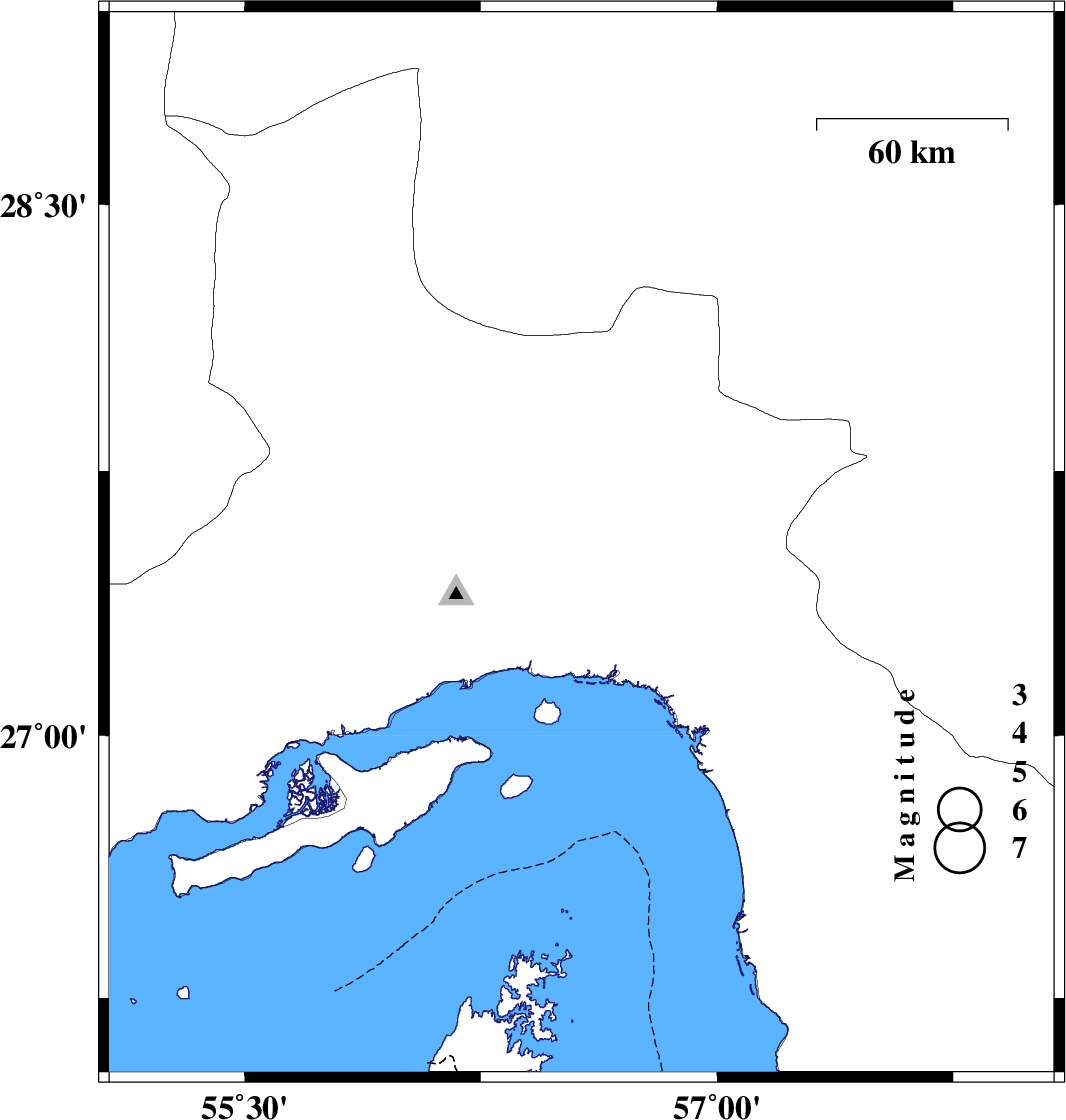 | 2012/08/31 | 09:30:46.1 | 14:00:46.1 | 27.54 | 56.57 | 14 | ML:3 | Hormozgan Province, 49 km North-East of Bandar-e abbas | ||